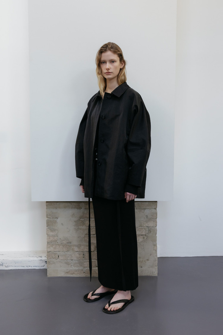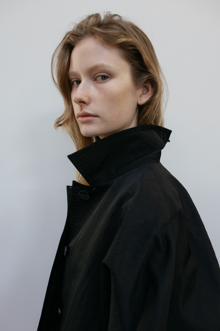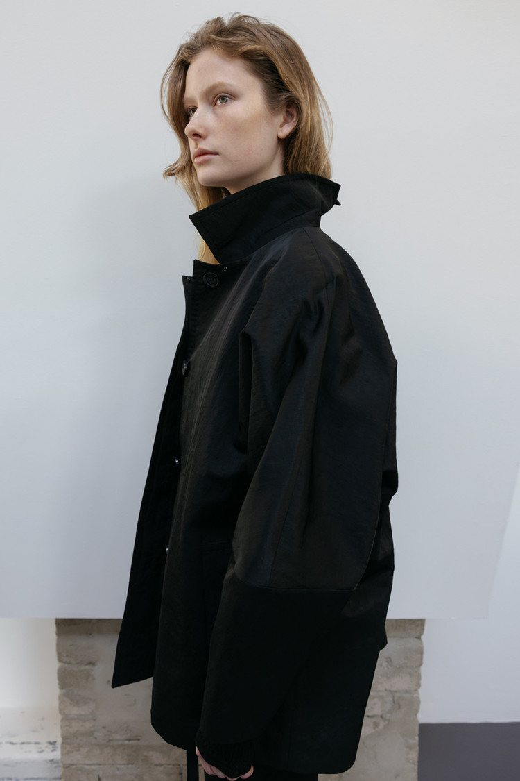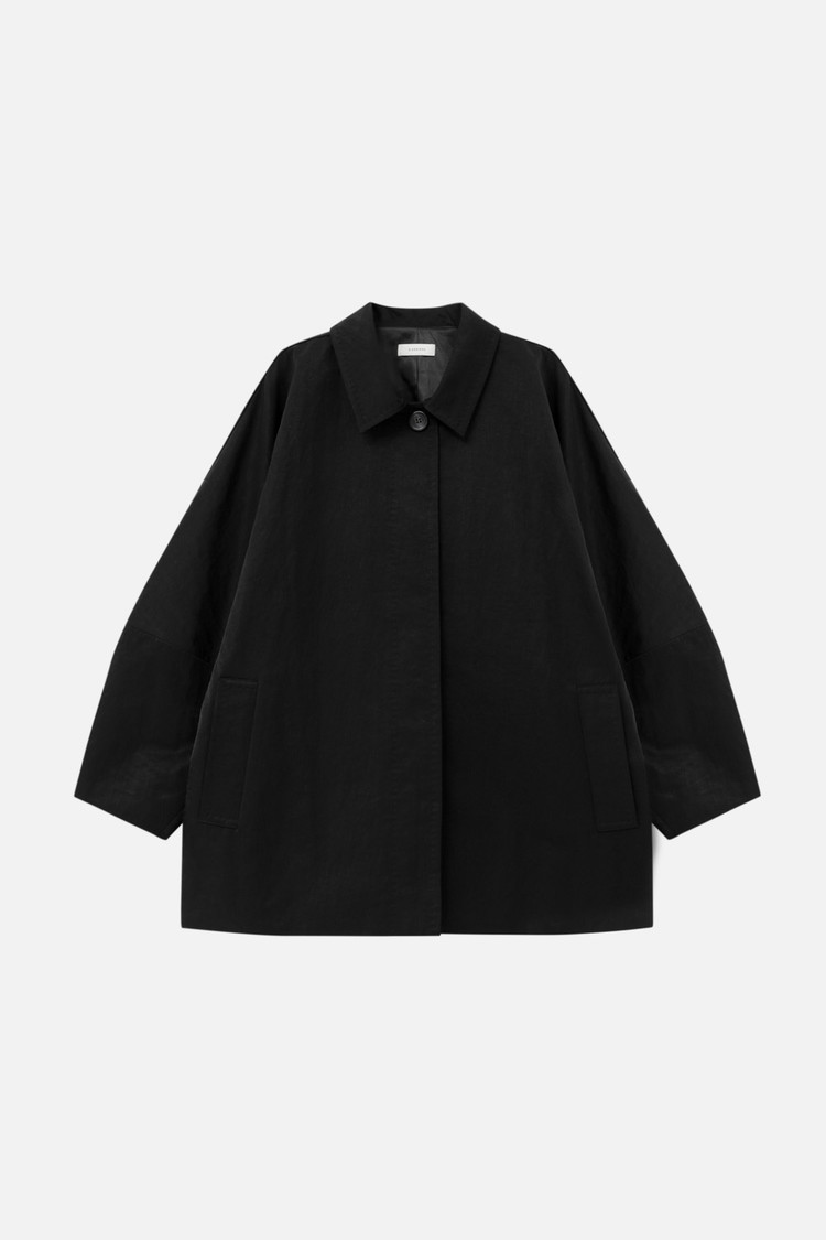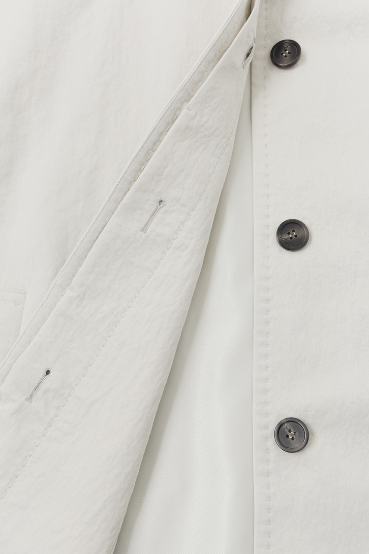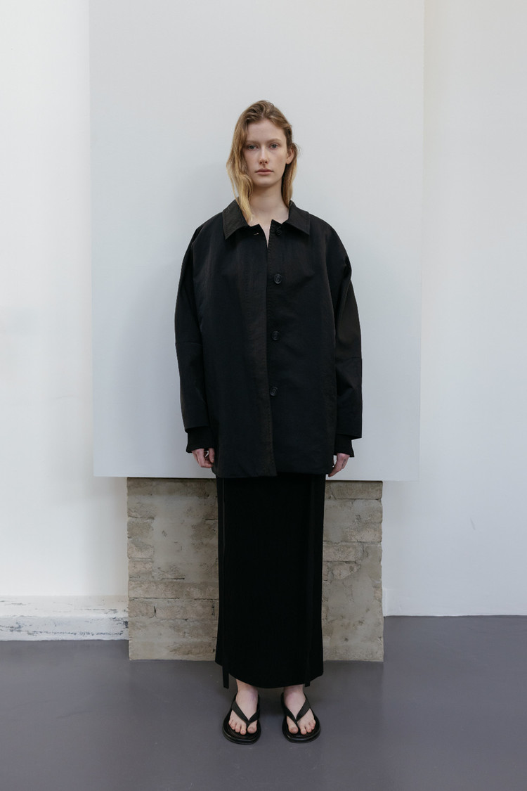 내추럴한 크링클 텍스처와 은은한 광택이 돋보이는 하프 트렌치입니다.