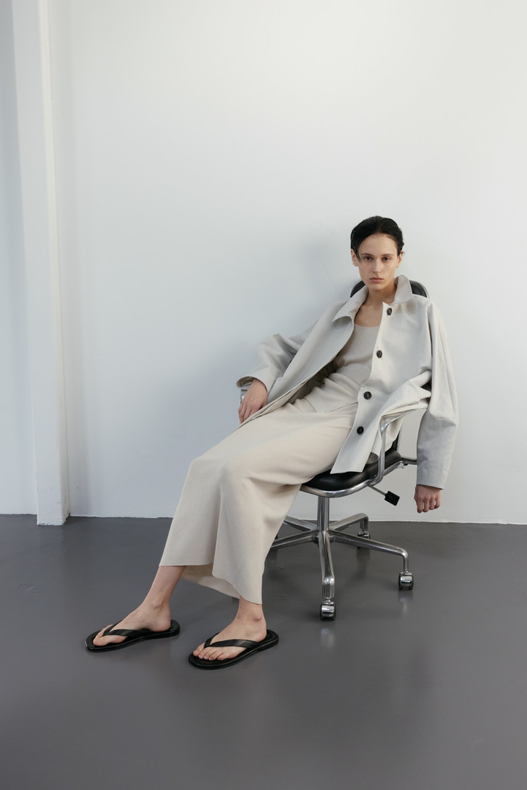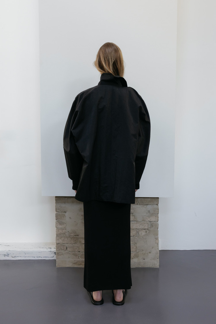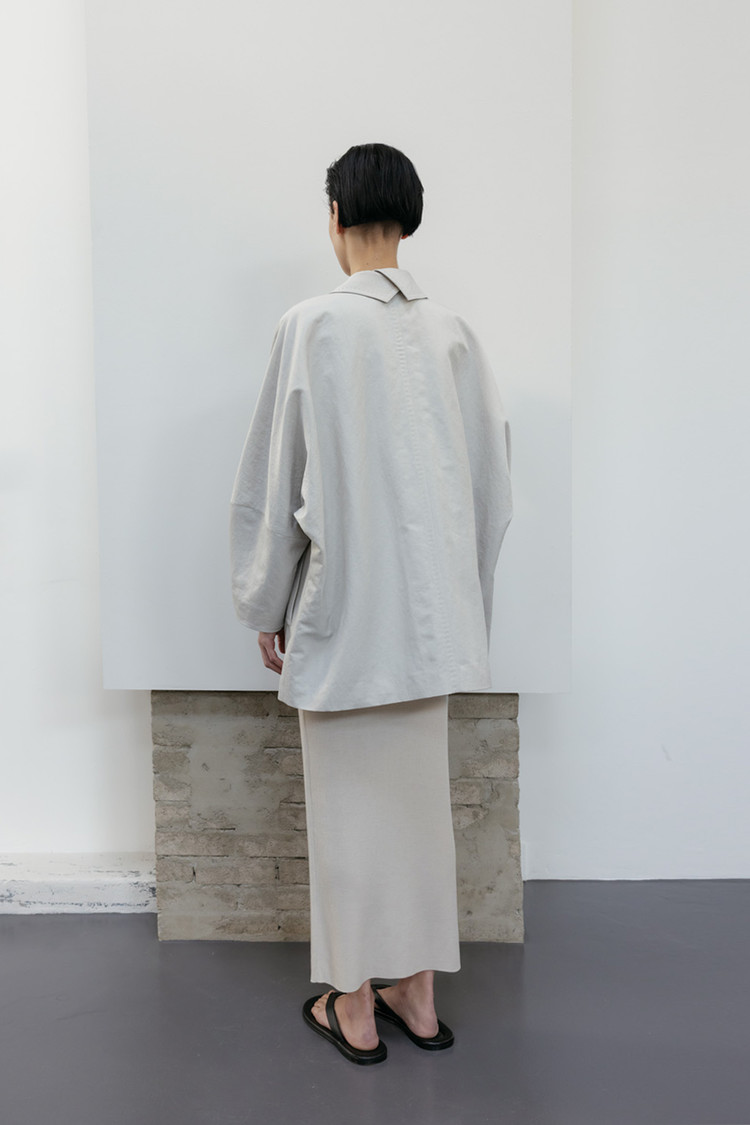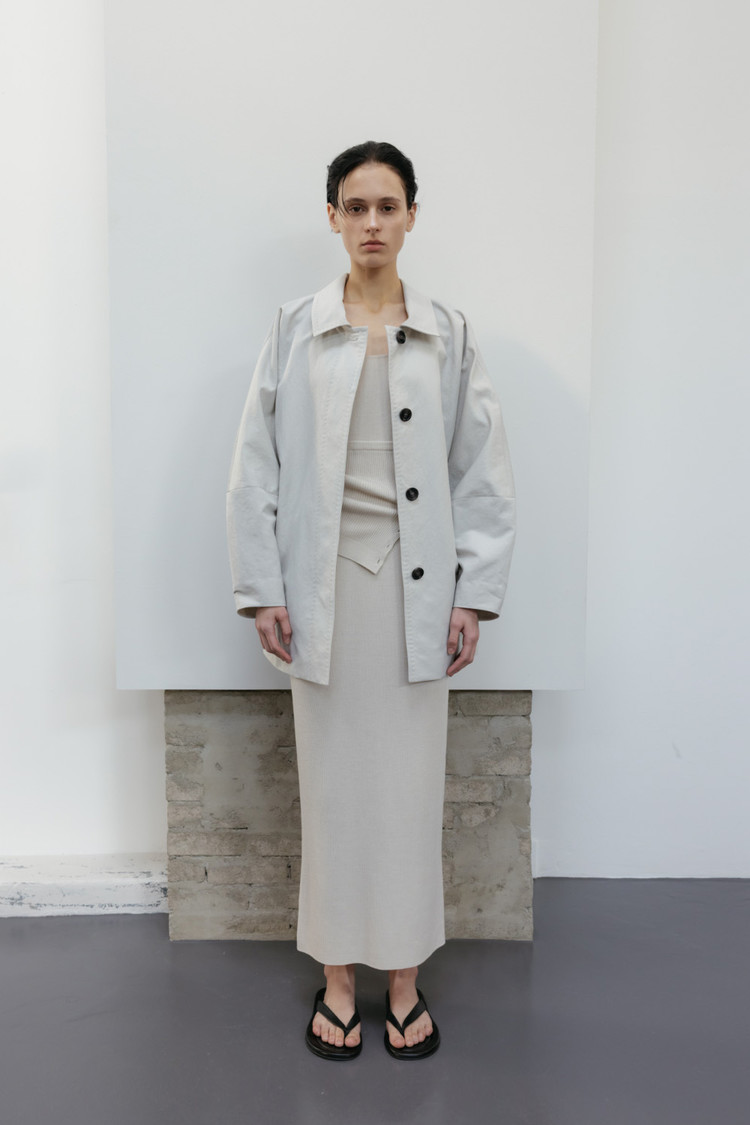 라운드하게 떨어지는 슬리브 라인과 단단한 형태감의 숄더 라인으로 이루어진 구조적인 패턴이 돋보입니다.