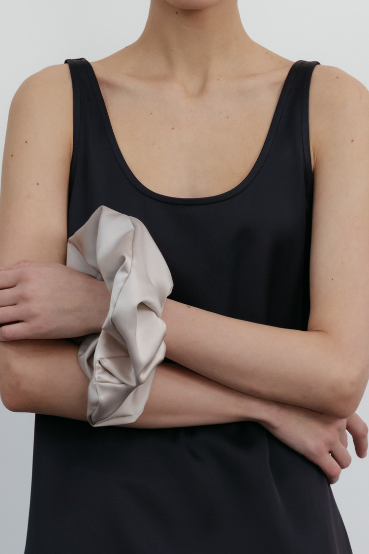 은은한 광택감의 새틴 소재로 제작된 오버사이즈 스크런치입니다.