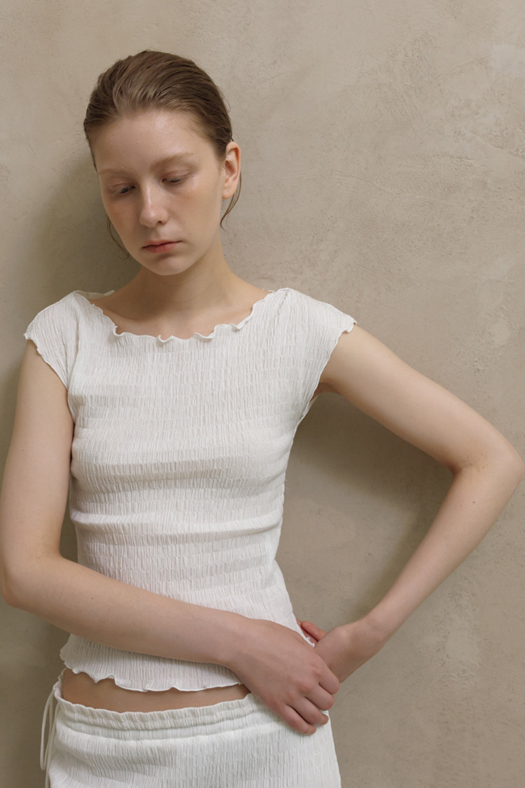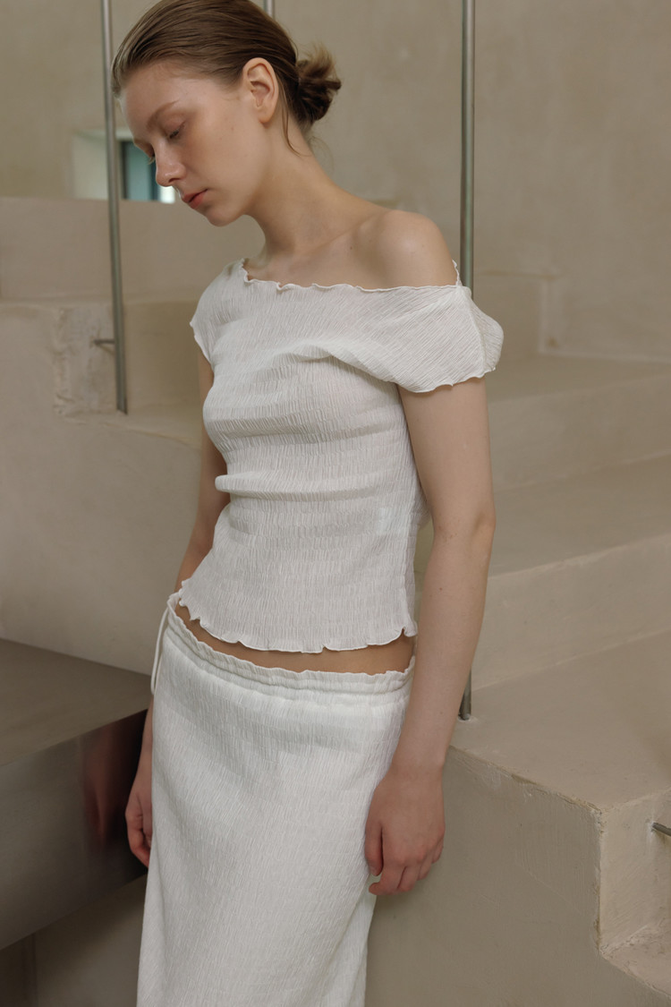 가벼운 소재감과 크링클 텍스처가 돋보이는 세미 오프숄더 탑입니다.