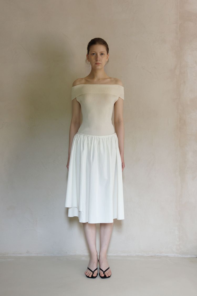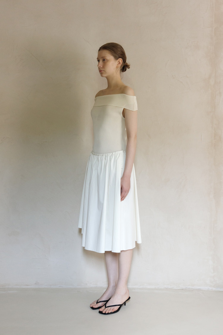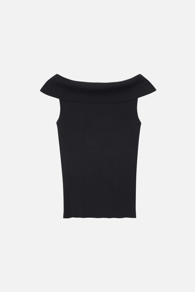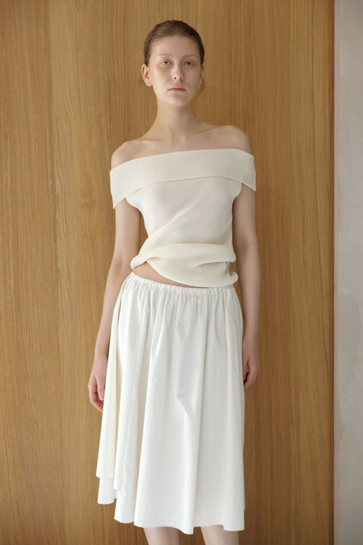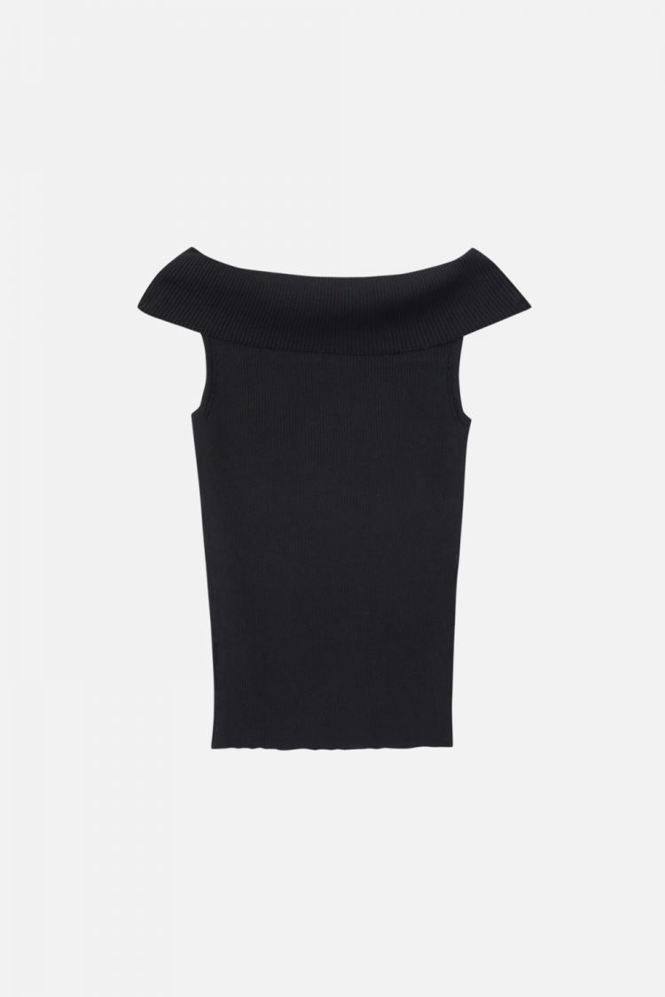 어깨선을 드러내는 오프숄더 디자인으로 페미닌한 무드를 강조한 니트 탑입니다.