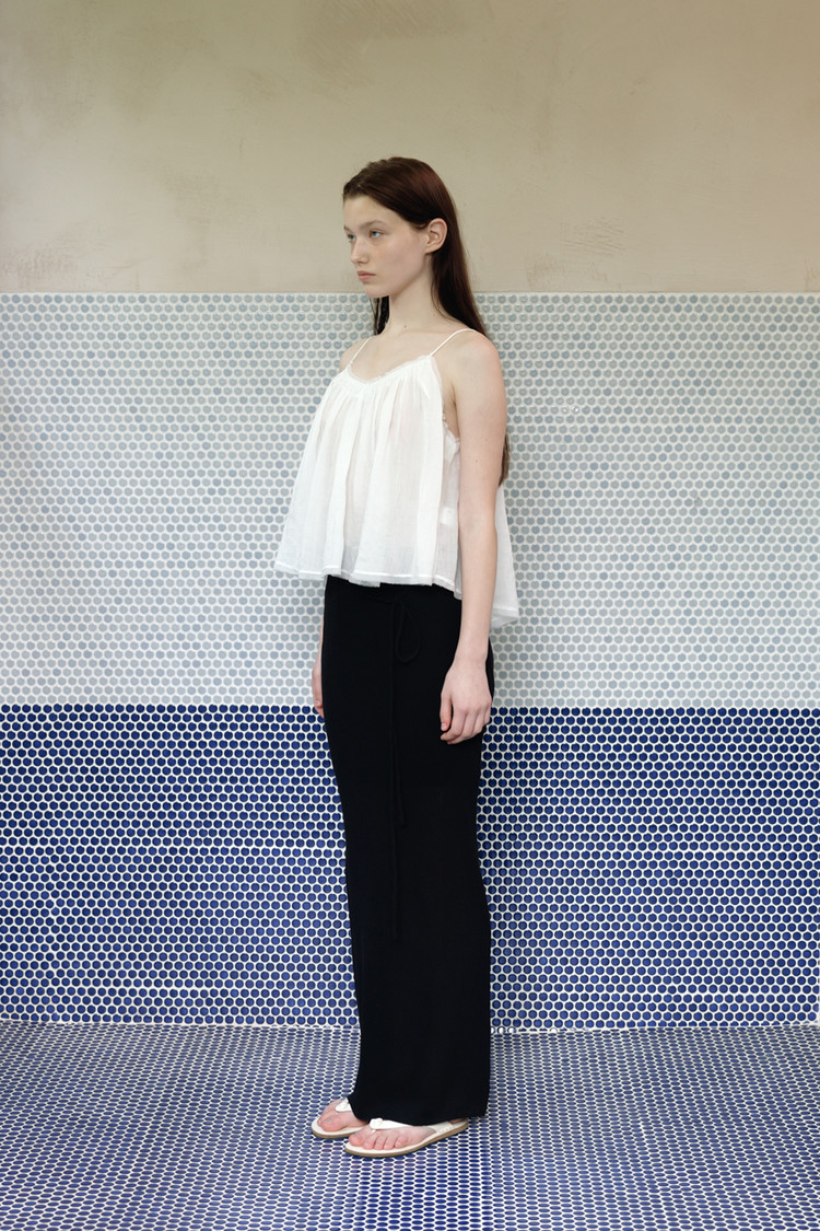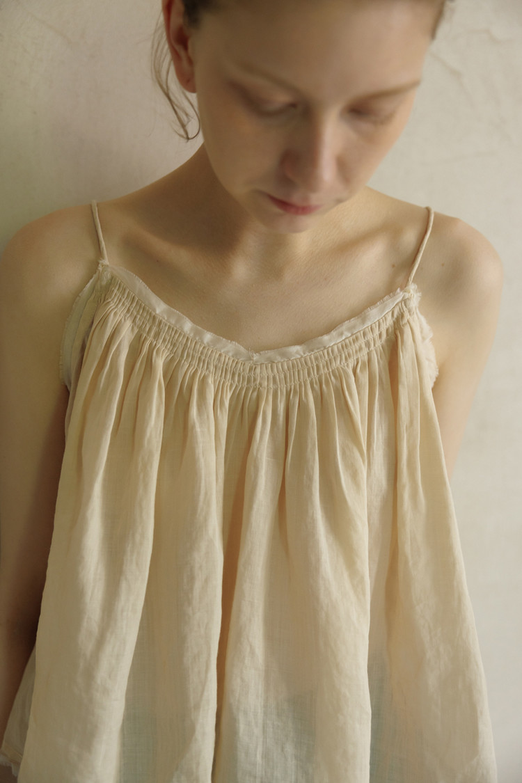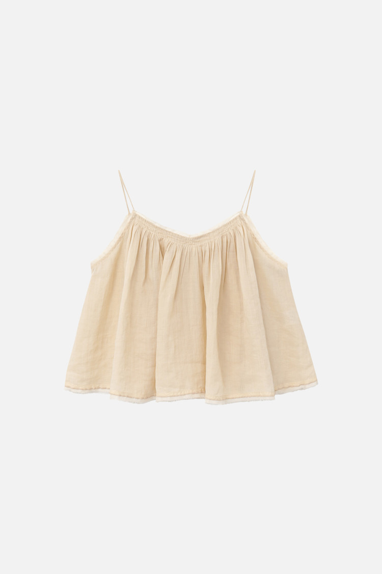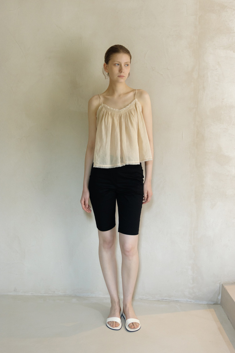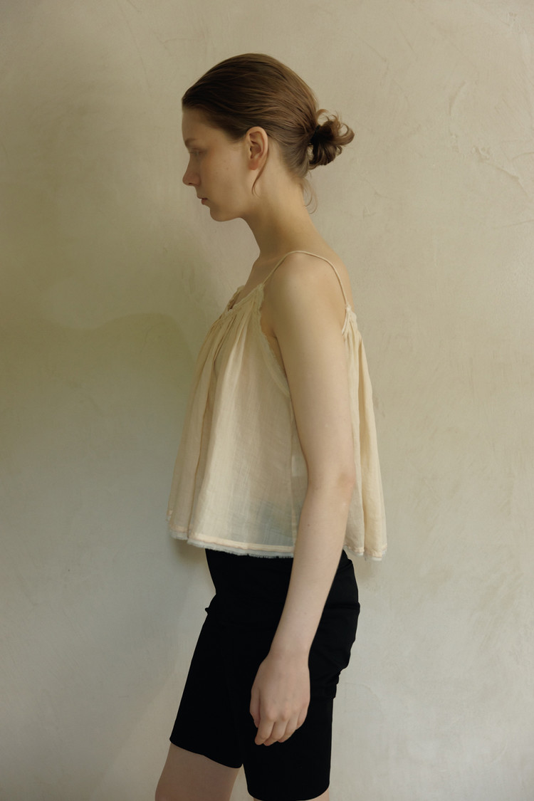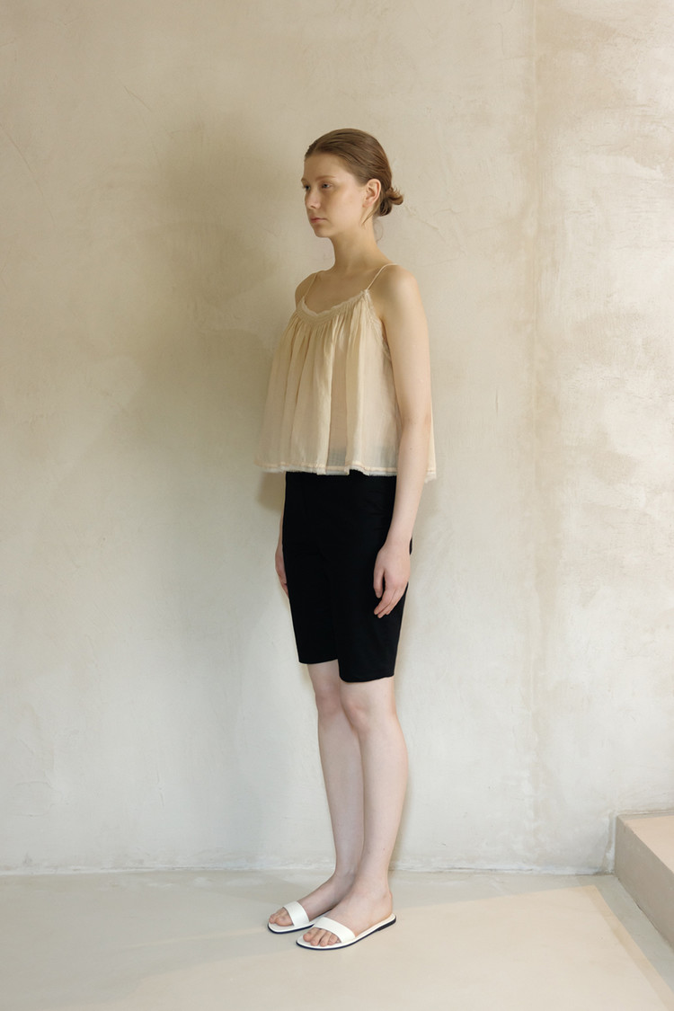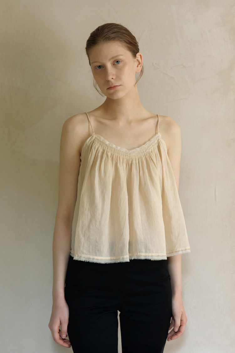 내추럴한 린넨 텍스처와 은은한 광택의 실키한 소재가 조화를 이루는 슬리브리스 탑입니다.
