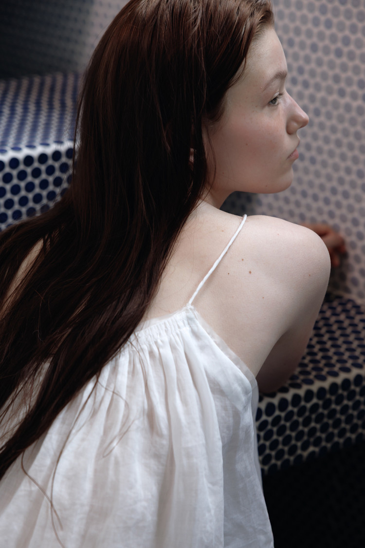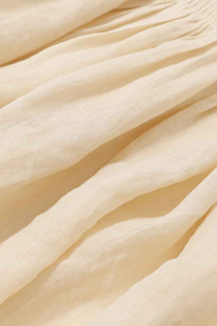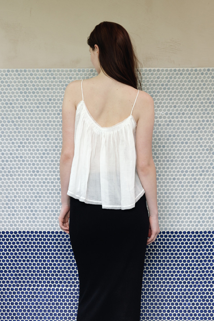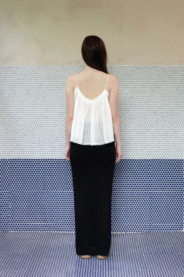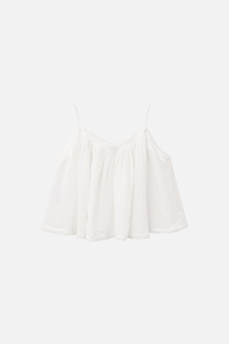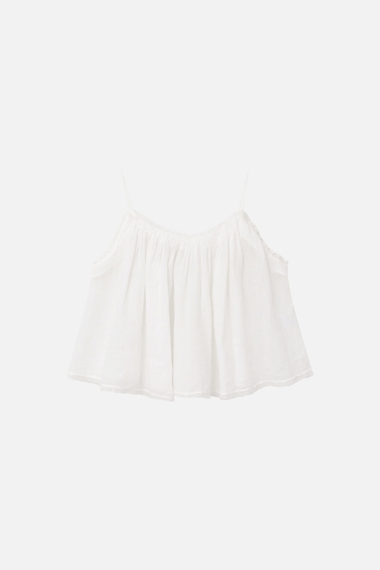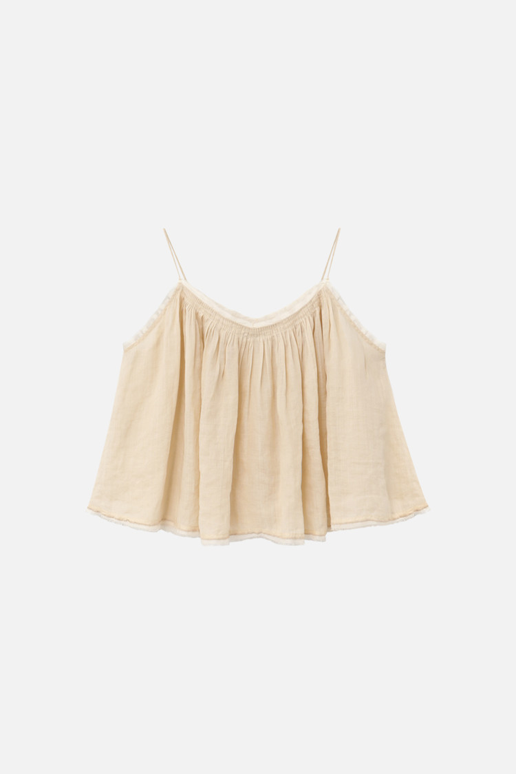 내추럴한 린넨 텍스처와 은은한 광택의 실키한 소재가 조화를 이루는 슬리브리스 탑입니다.