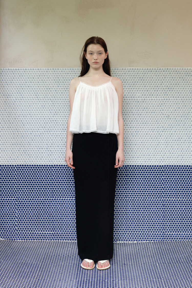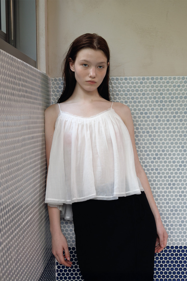 앞뒤 넥라인을 따라 정교하게 잡힌 플리츠 디테일이 고급스러우며, 전·후면에 레이어드된 시어 배색이 감각적인 입체감을 더합니다.