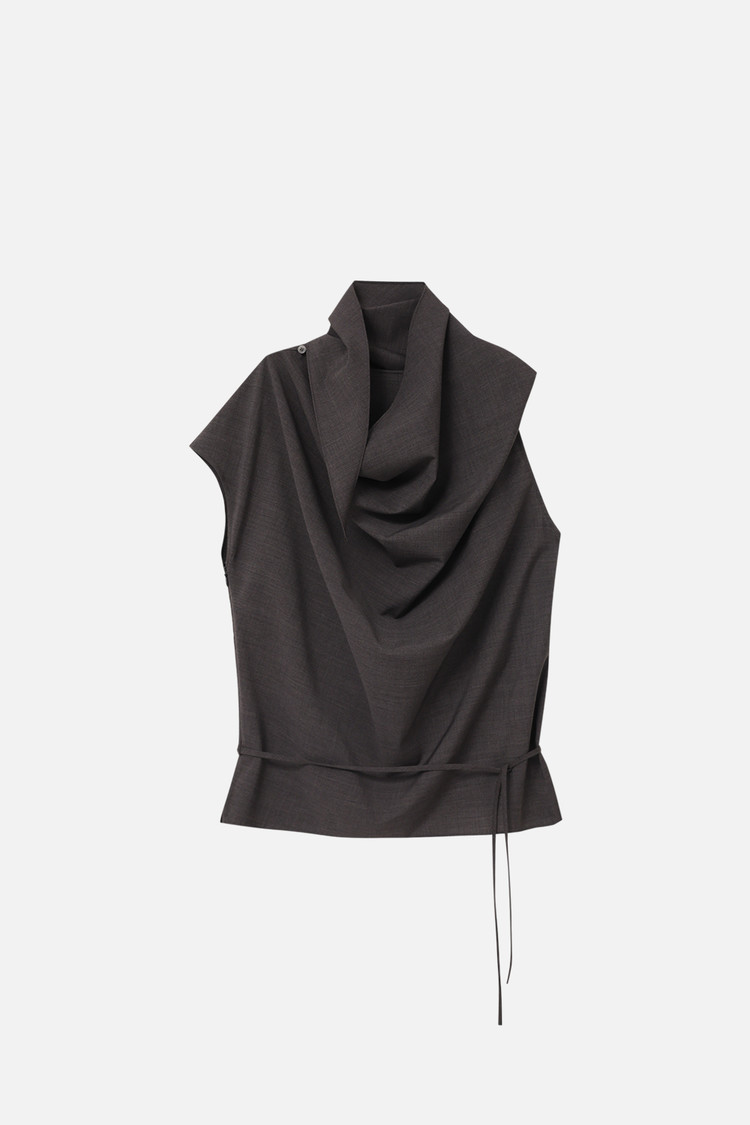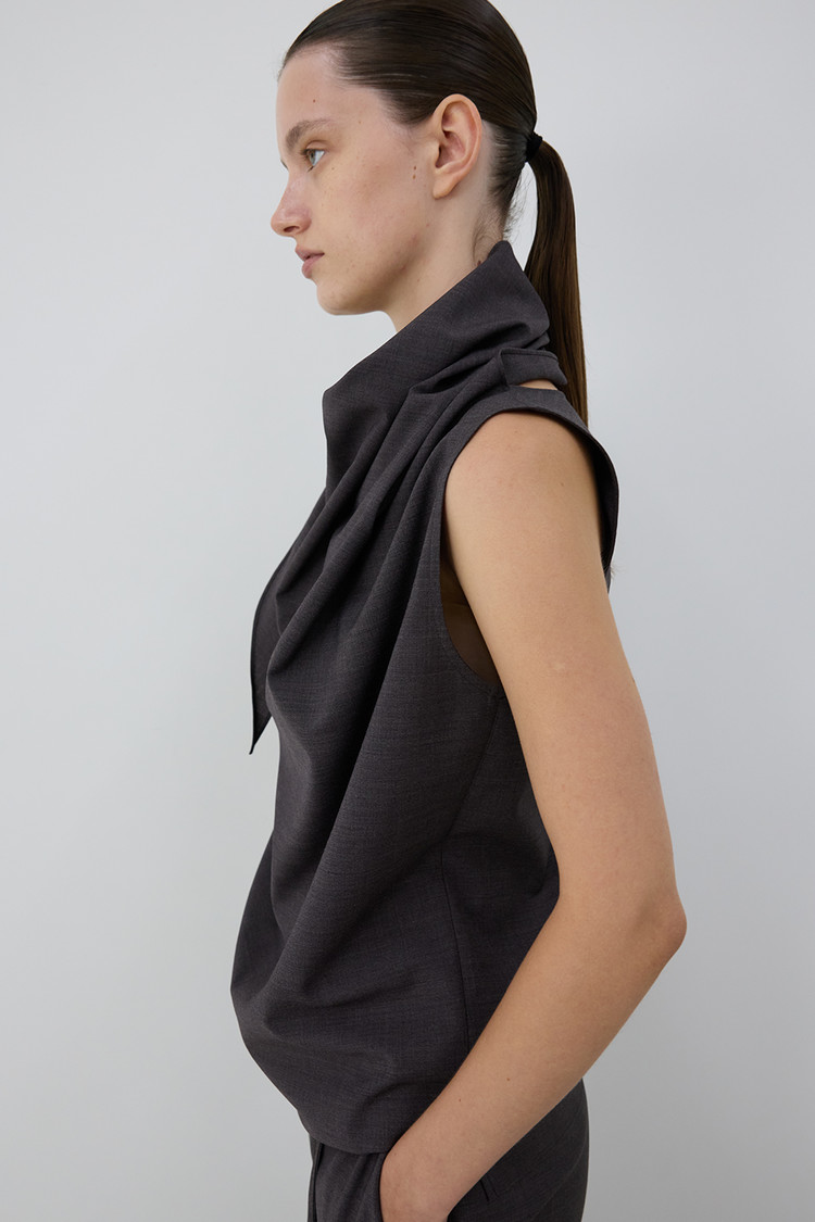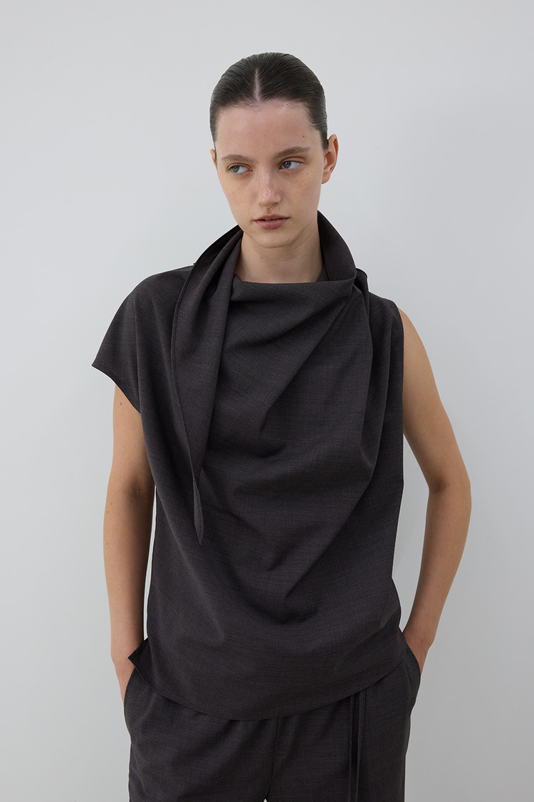 WOOL BLEND SCARF BLOUSE - CHARCOAL BROWN