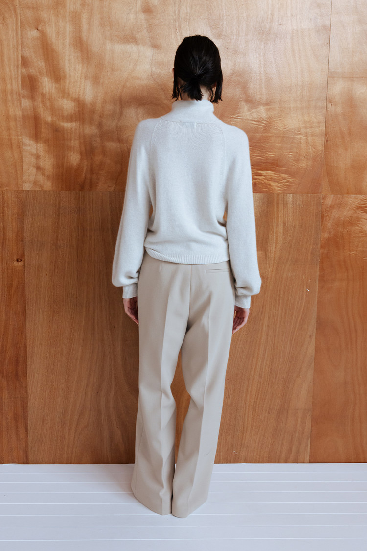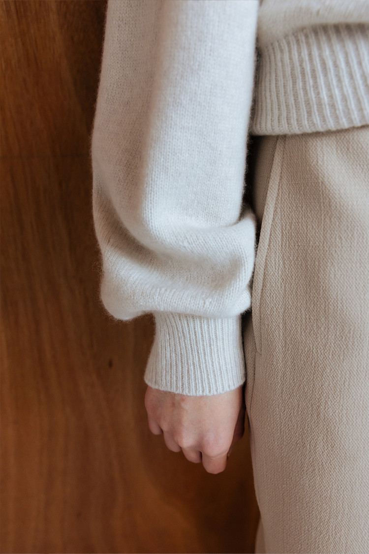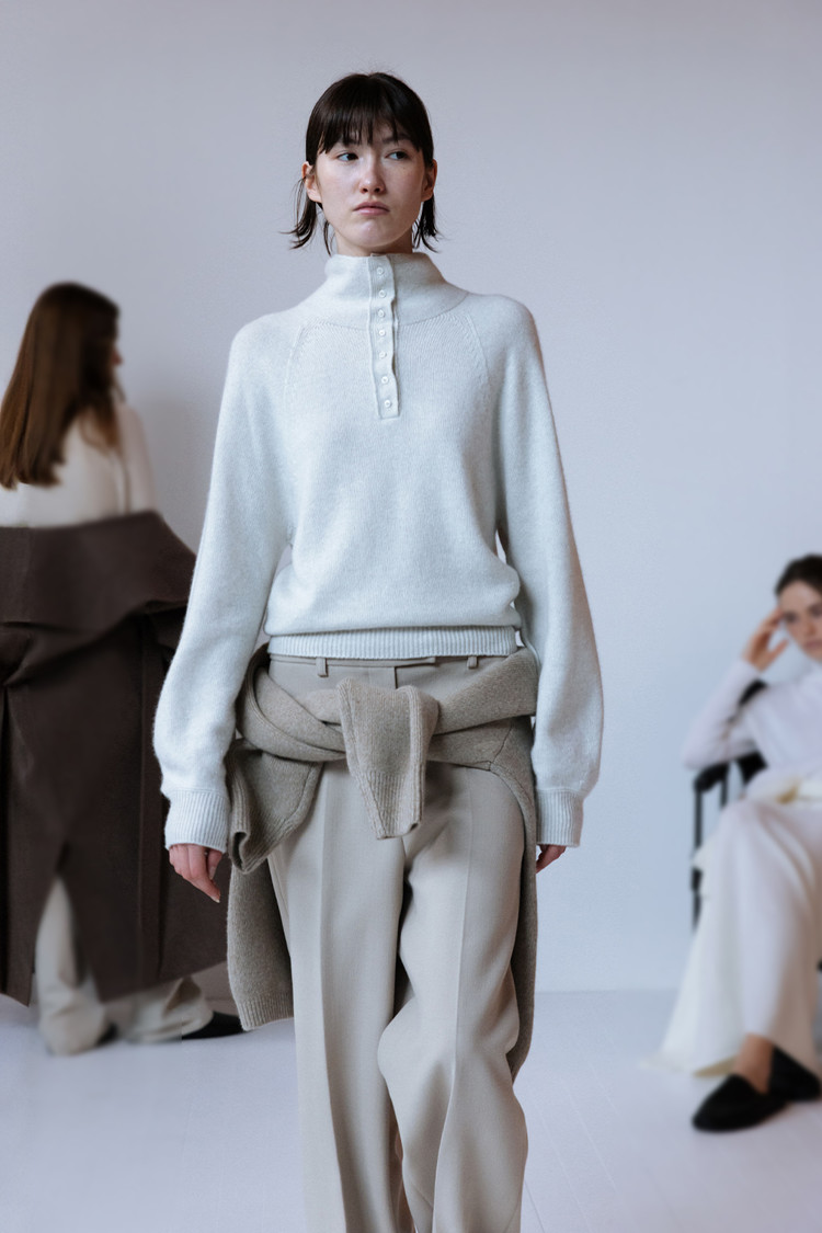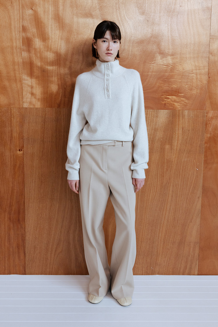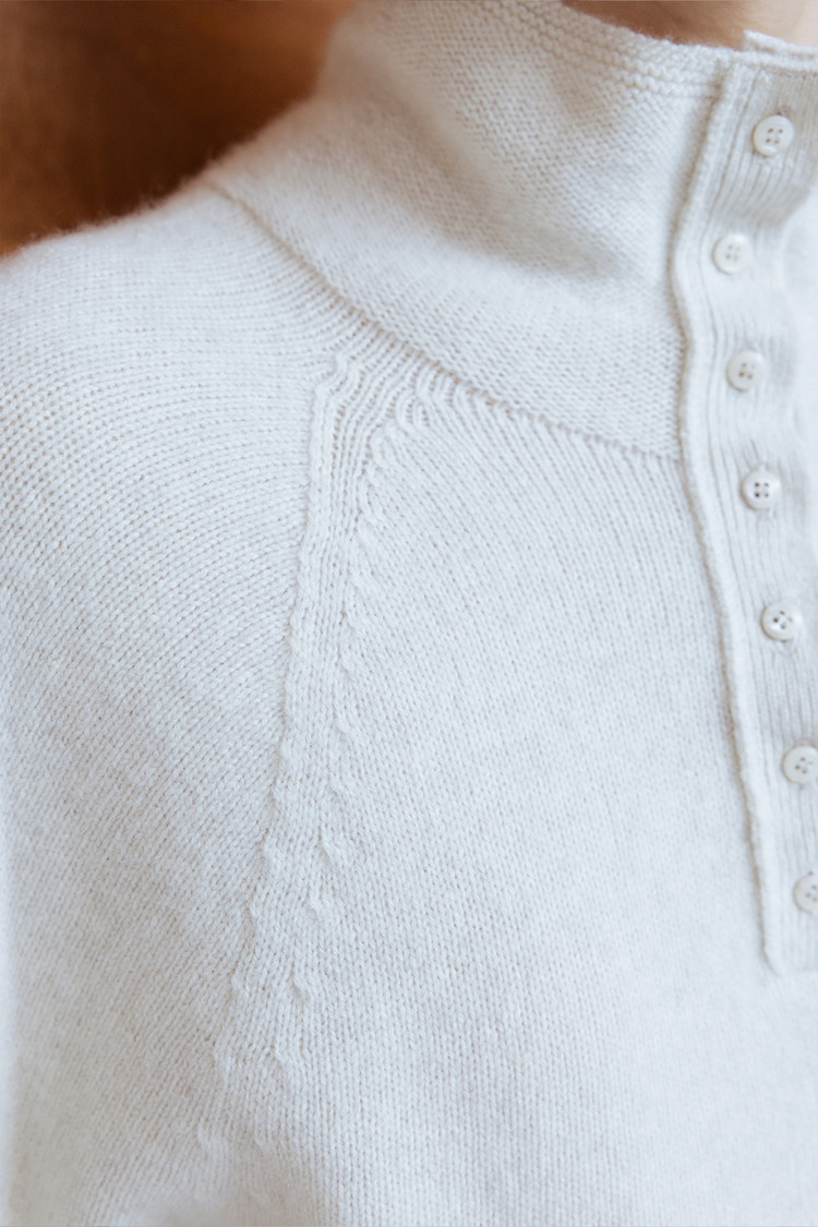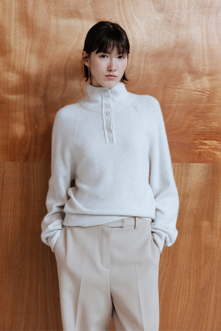 부드러운 터치감의 메리노울 블렌드 원사로 제작된 버튼업 심리스 니트 탑