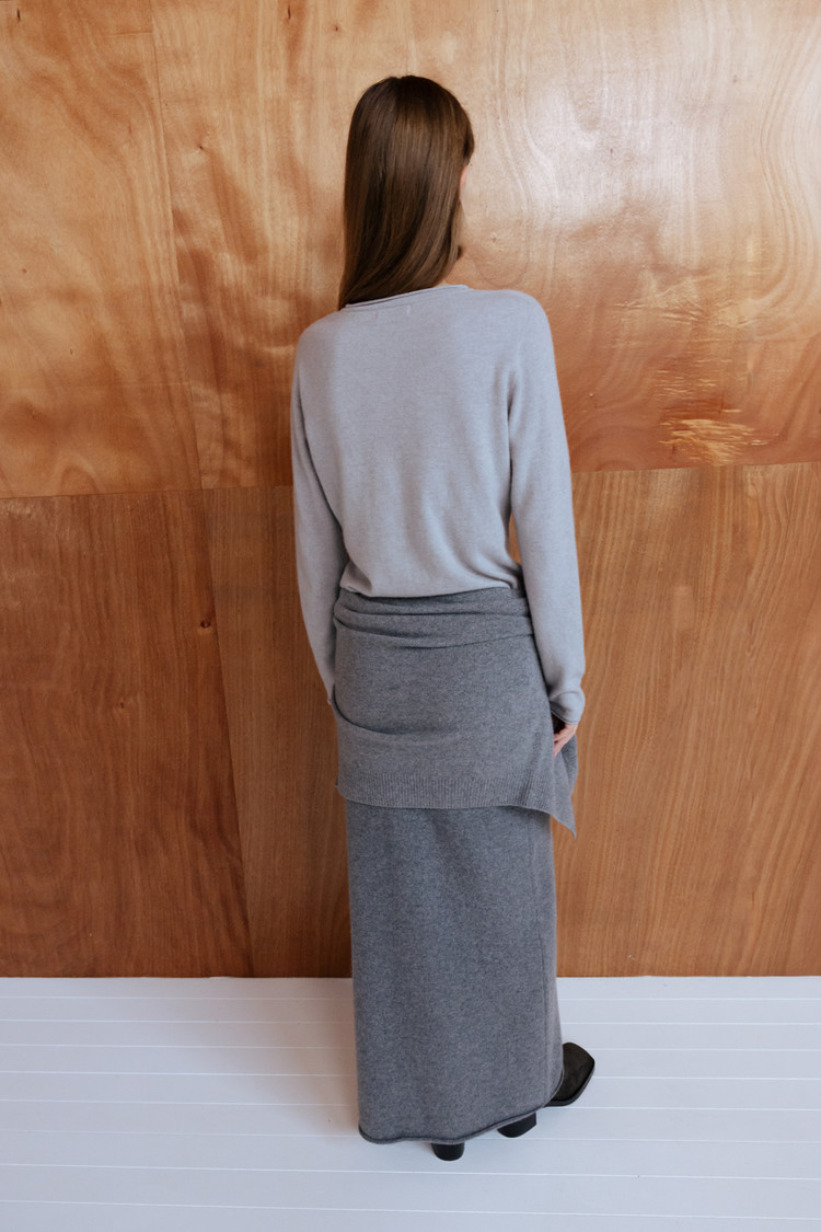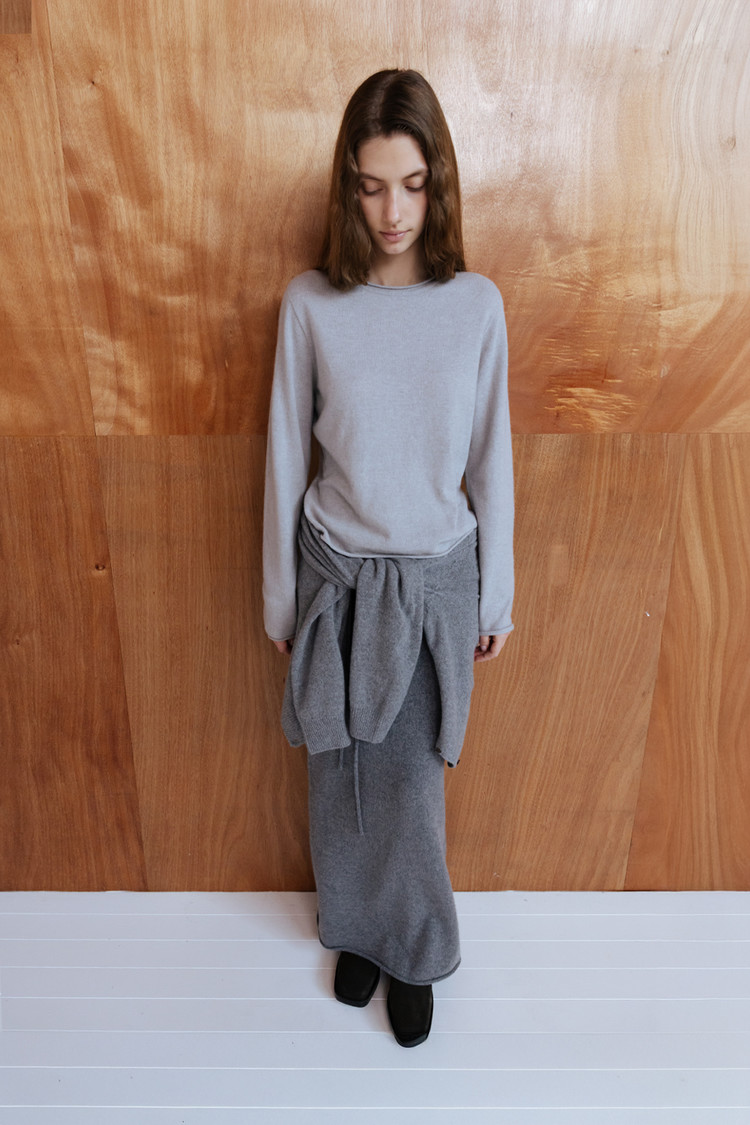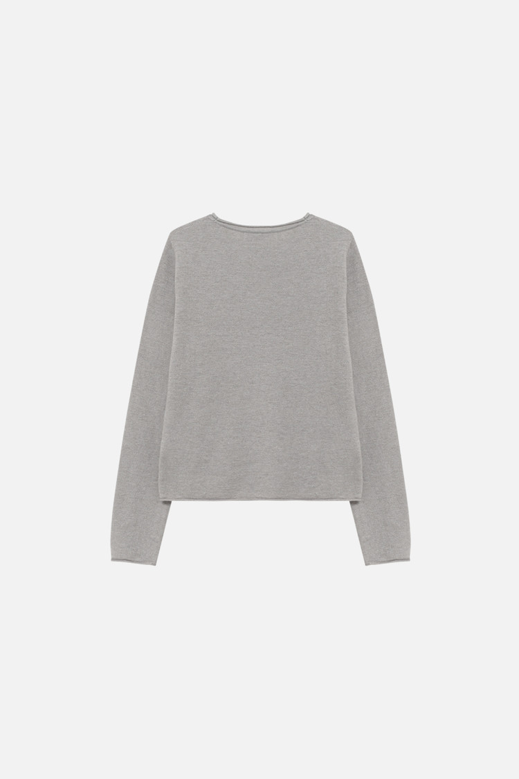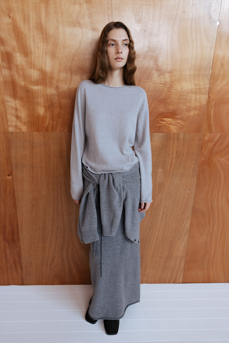 CASHMERE BLEND ROUND NECK FITTED KNIT TOP - SILVER STONE