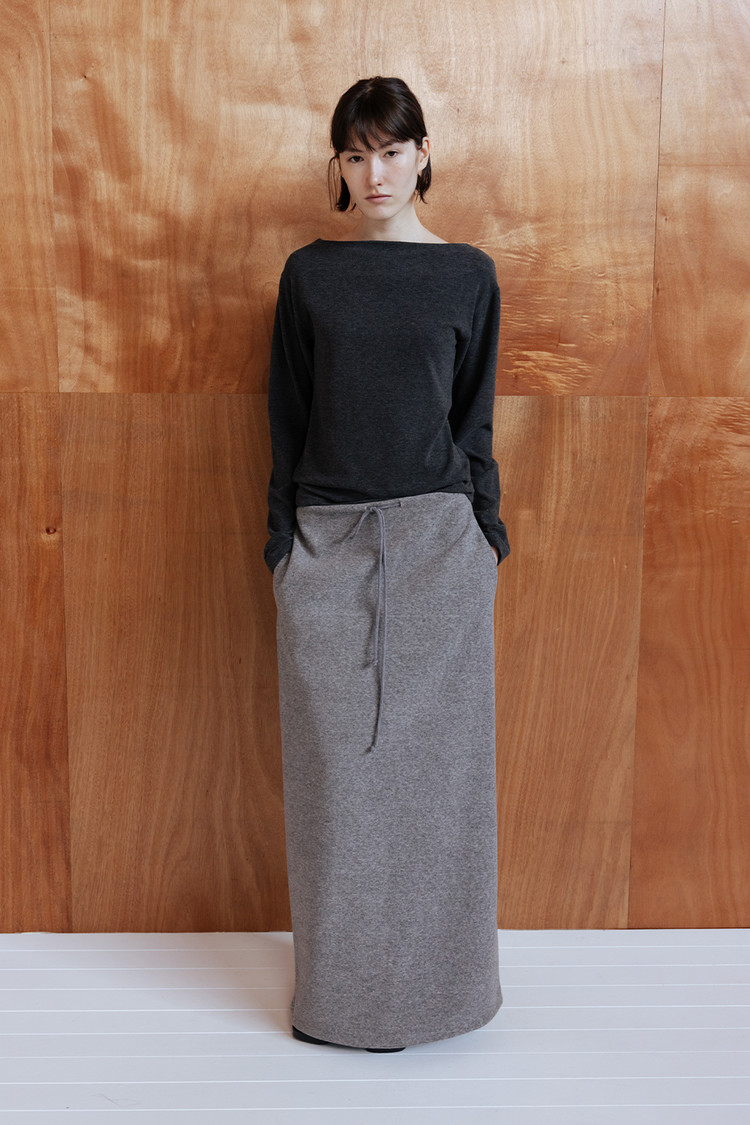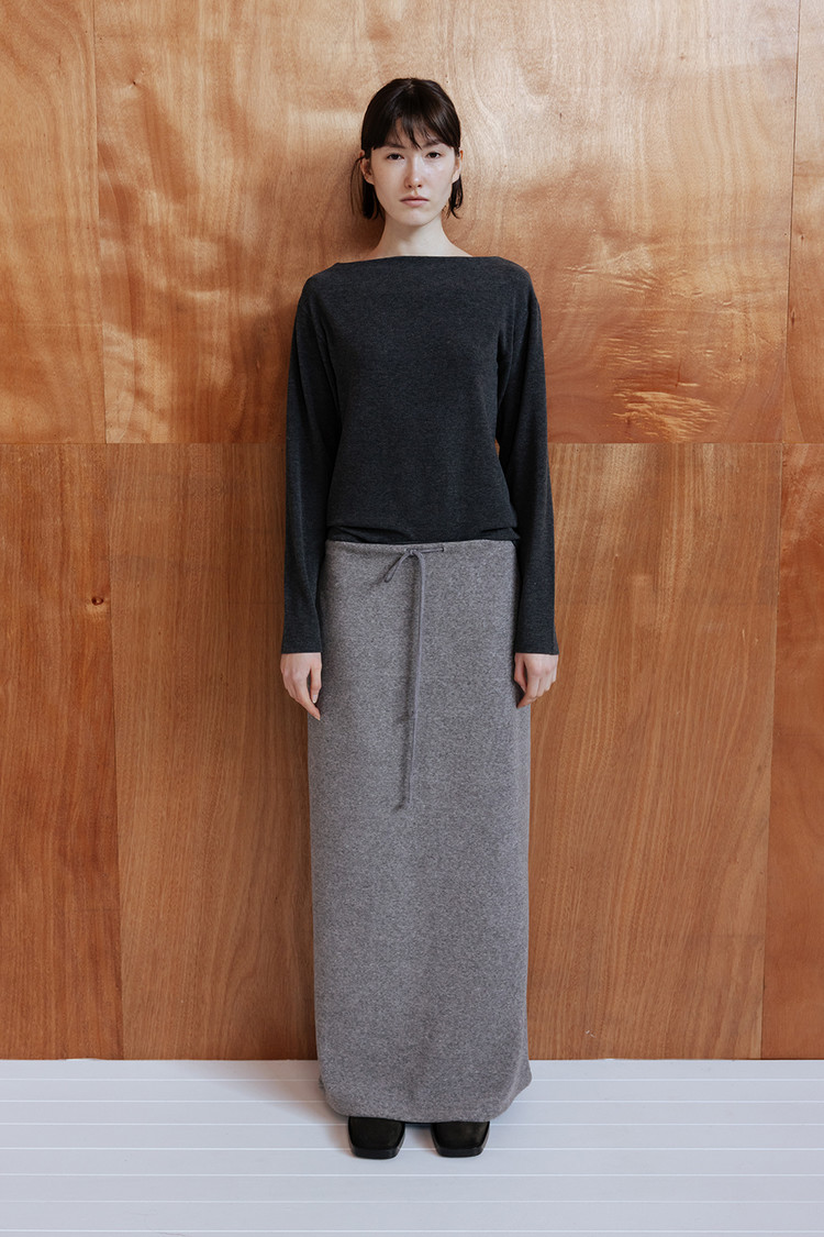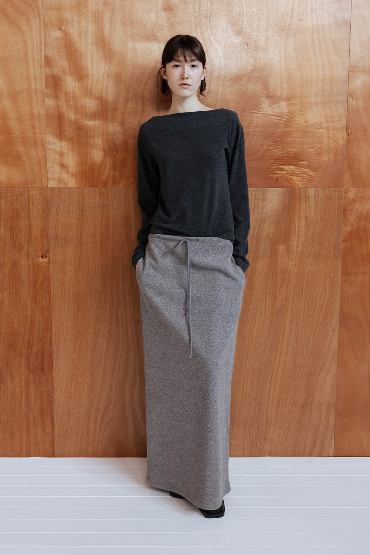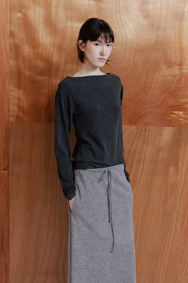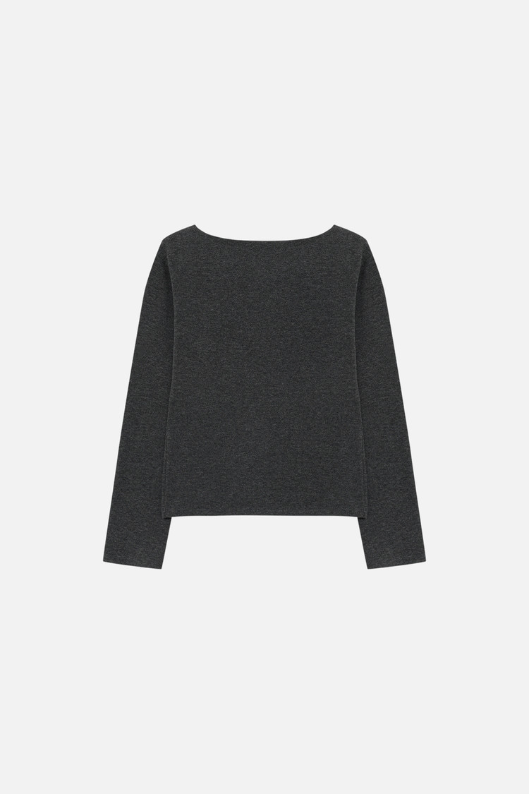 세련된 보트넥 라인과 자연스럽게 숄더를 감싸며 떨어지는 드롭 숄더 디자인으로 감각적인 무드 연출