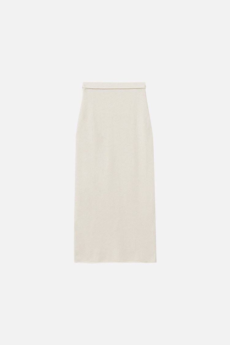 부드러운 터치감의 메리노울 블렌드 원사로 제작된 스트링 니트 스커트