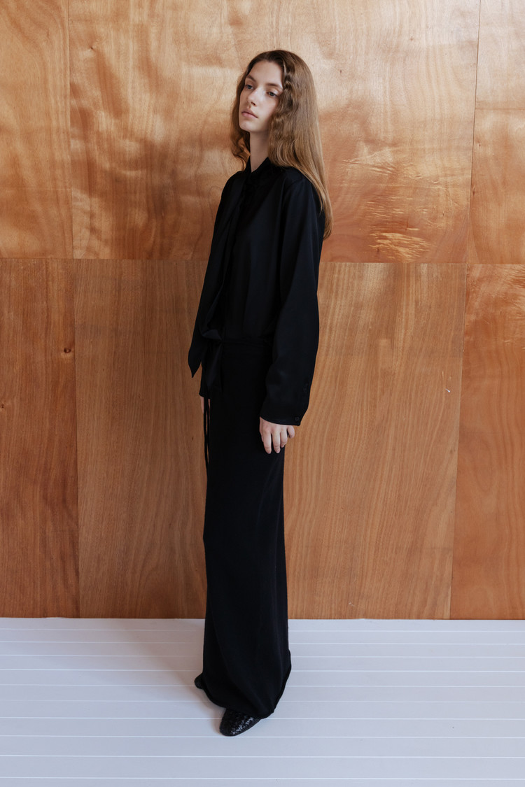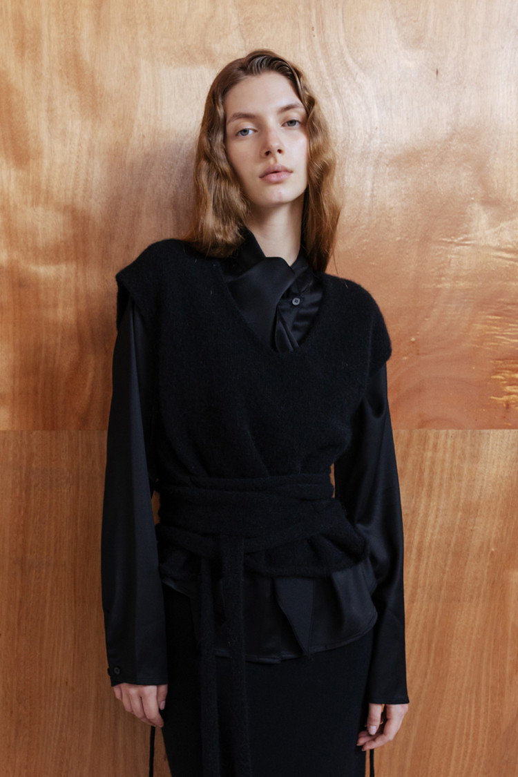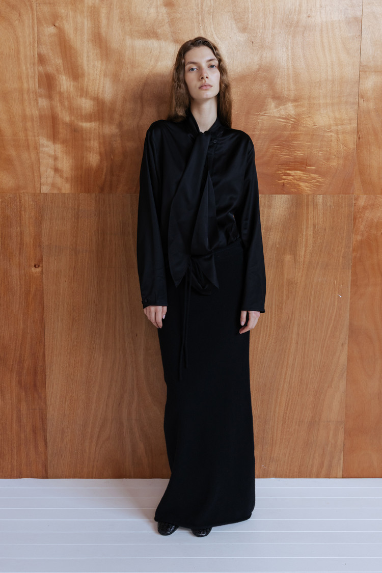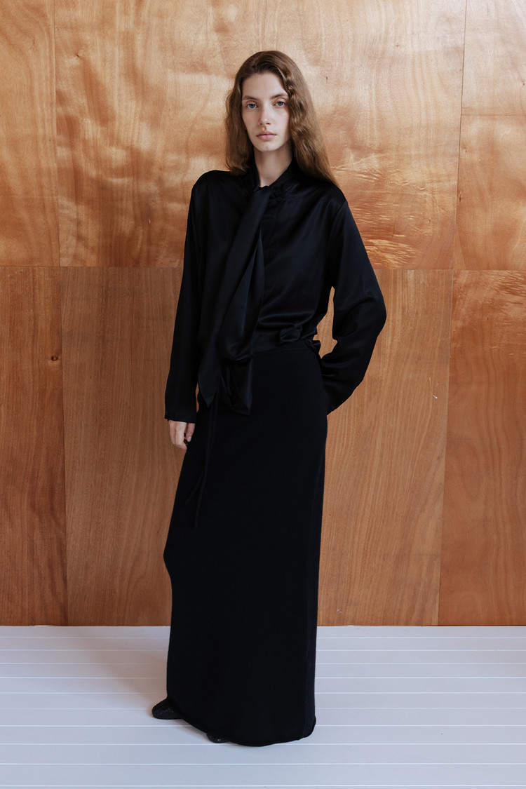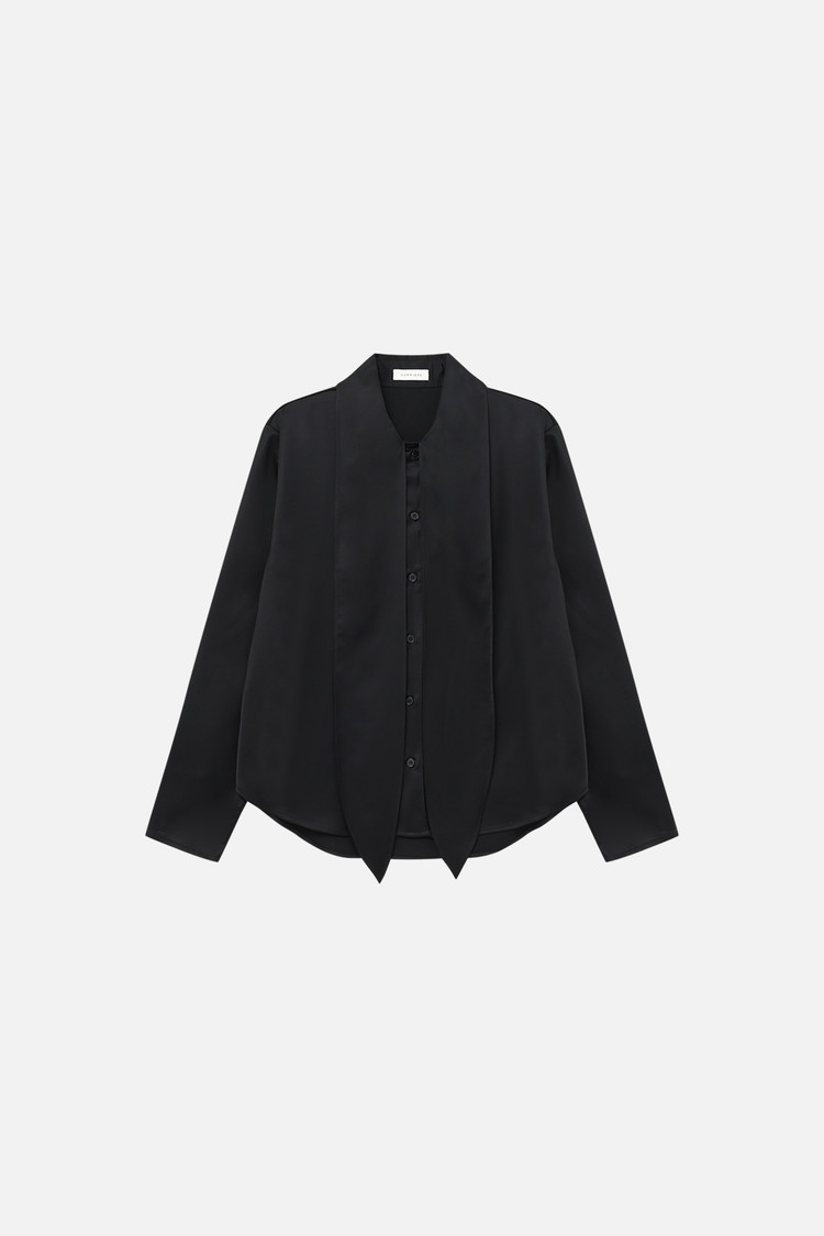 네크라인을 따라 자연스럽게 흐르는 타이 디테일로 스카프를 두른 듯한 세련된 무드 연출