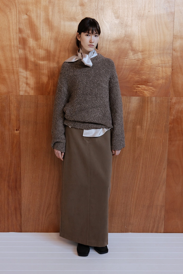 부드러운 터치감을 선사하는 브러시 가공이 더해진 코튼 트윌 소재로 제작된 롱 스커트