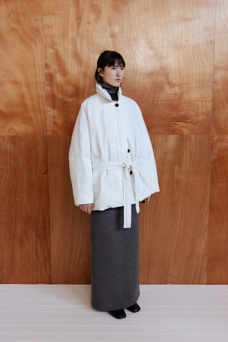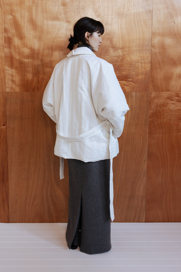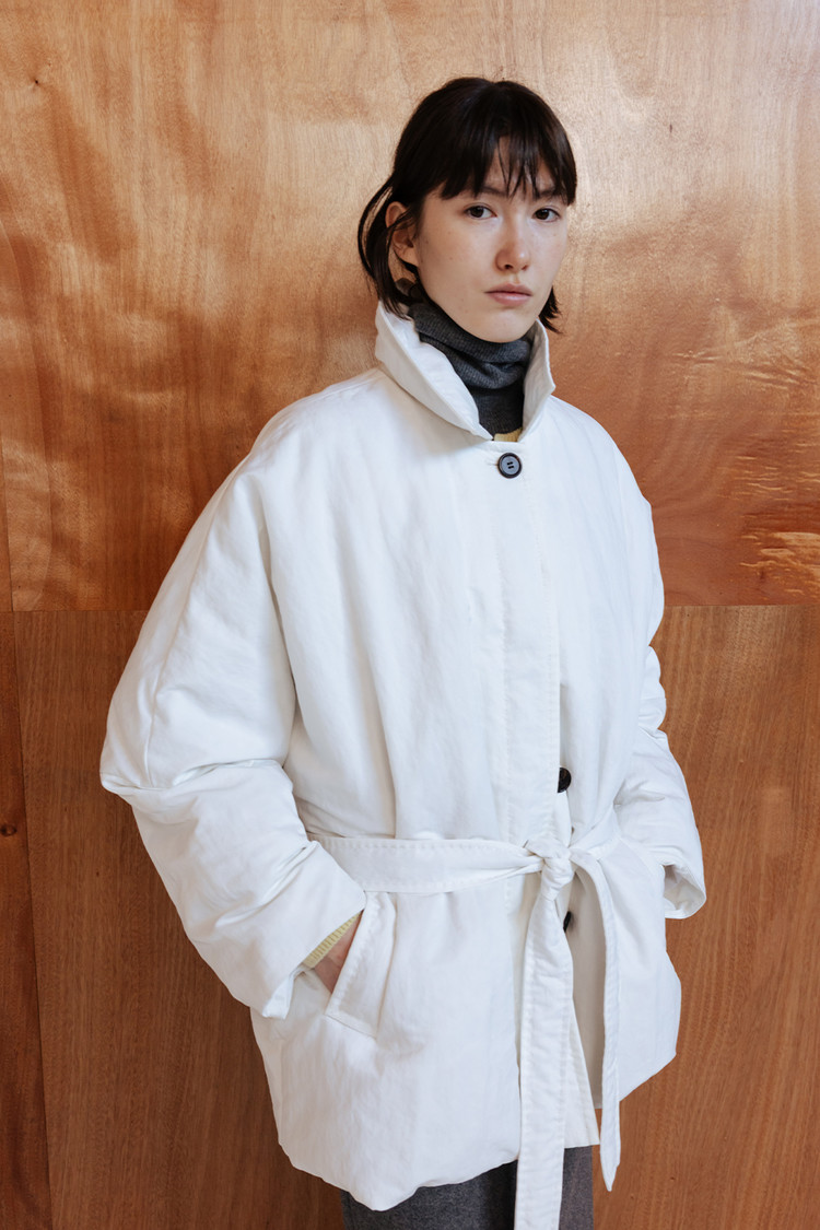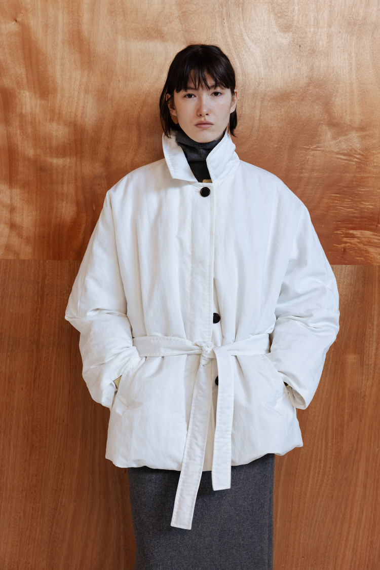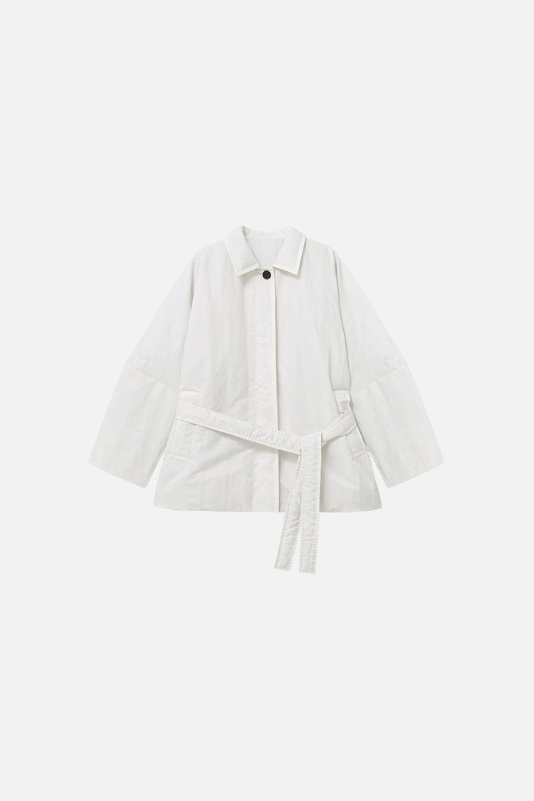 동일 소재의 벨트로 허리 라인을 조절해 자연스러운 볼륨 속에서도 정제된 실루엣 연출 가능