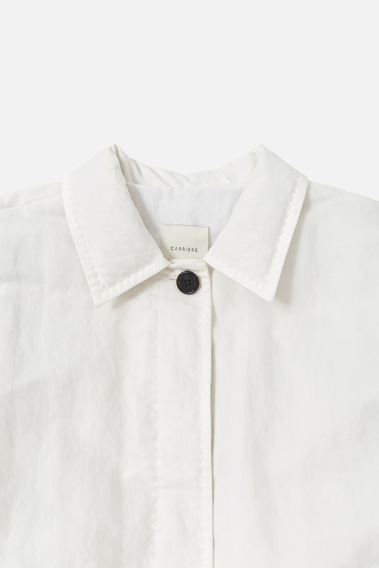 내추럴 크링클 텍스처와 은은한 광택감이 돋보이는 구스 다운 하프 재킷