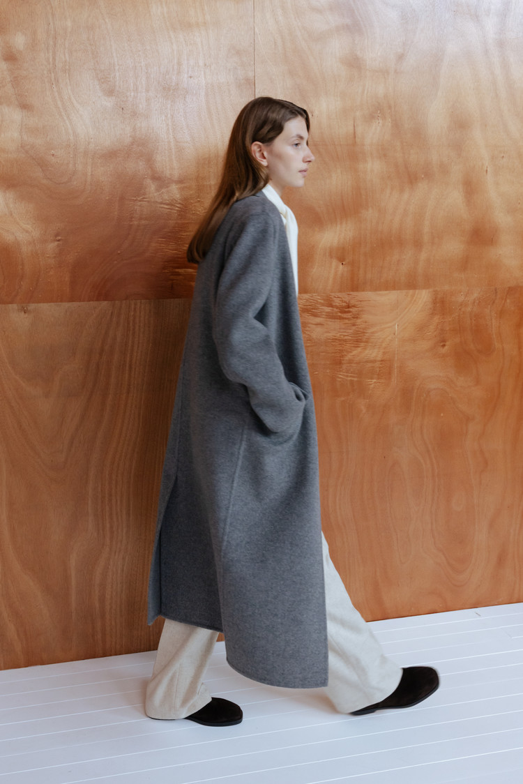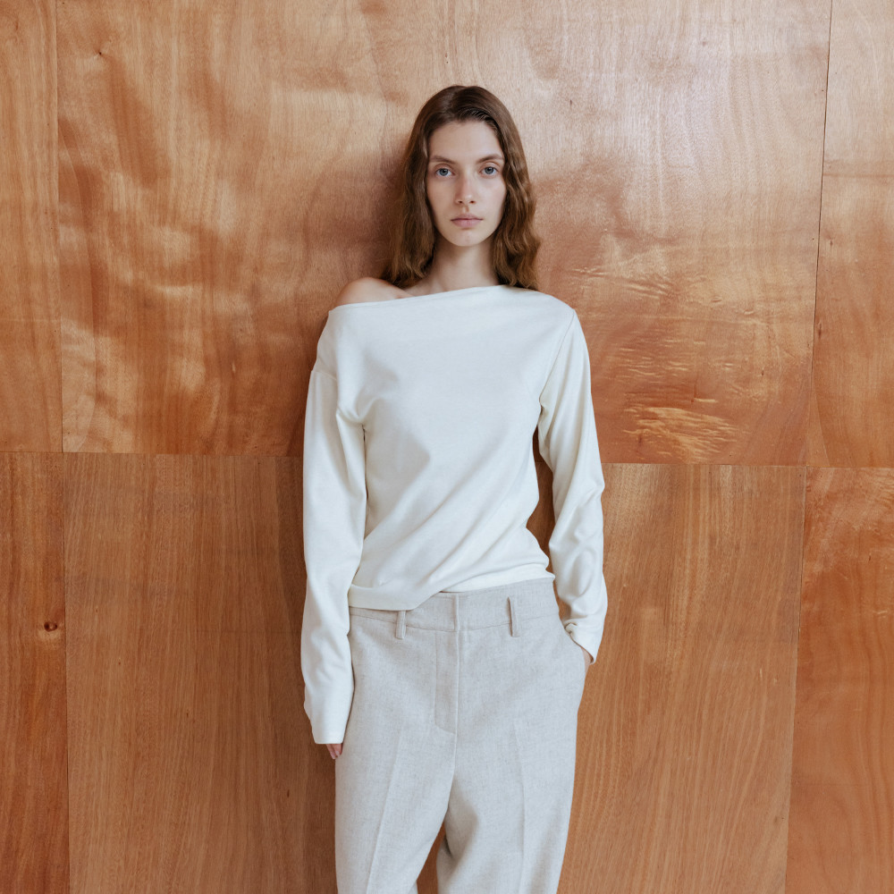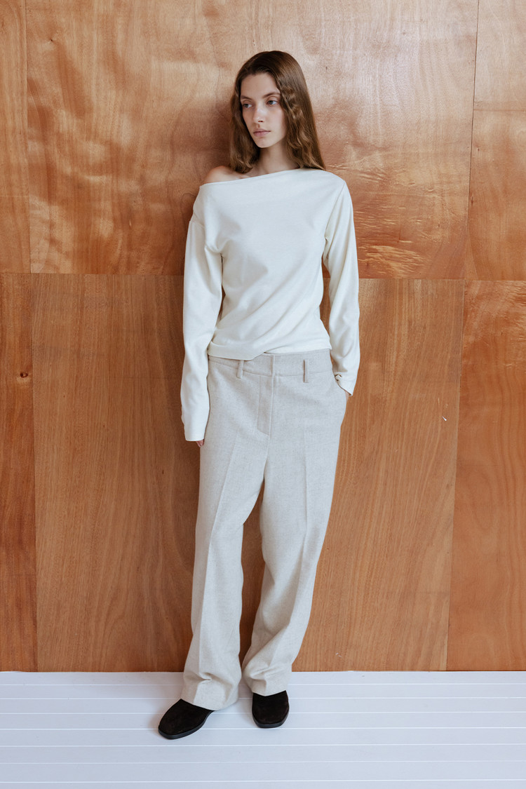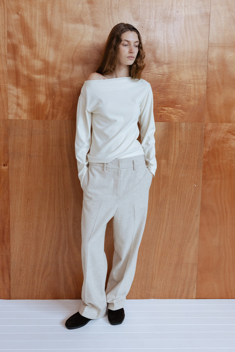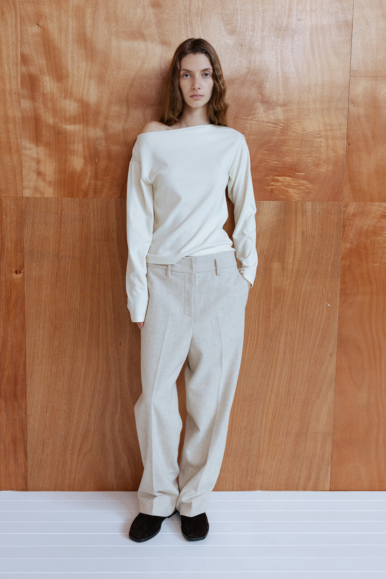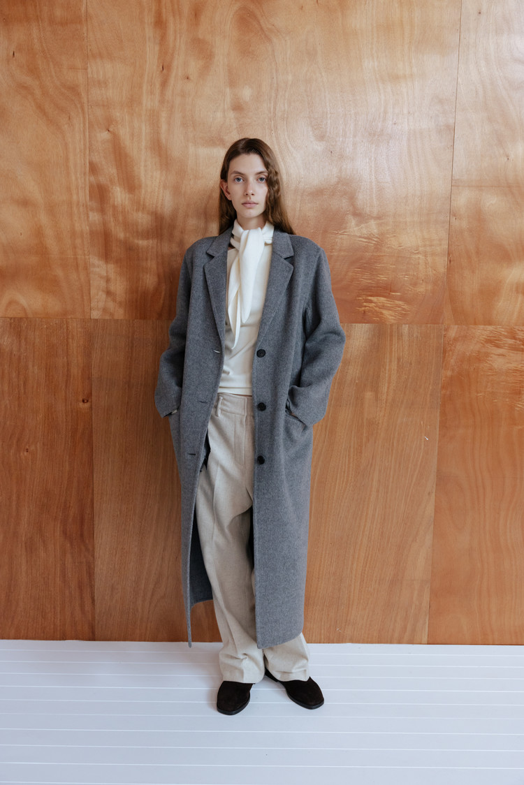 탄탄한 질감과 간결하게 떨어지는 세미 와이드 실루엣이 모던하고 정제된 무드 연출