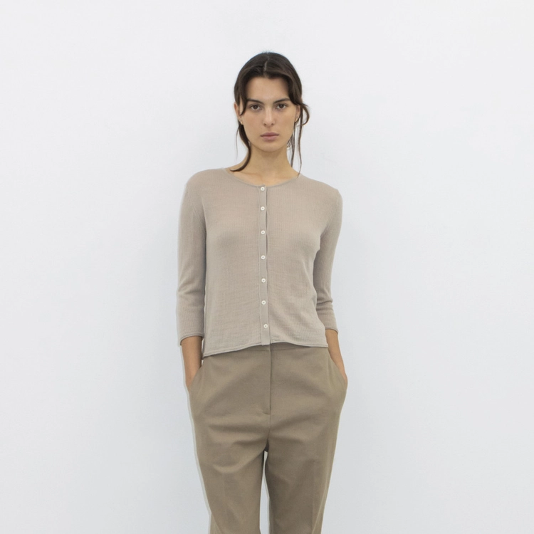 소모 울 블렌드 소재로 제작된 랩 니트 탑