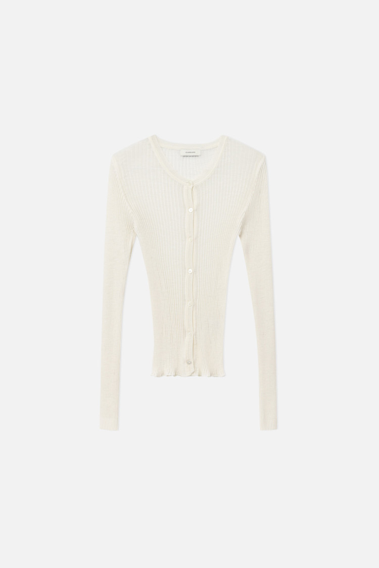가느다란 썸머울 소재로 제작된 라운드넥 가디건입니다.