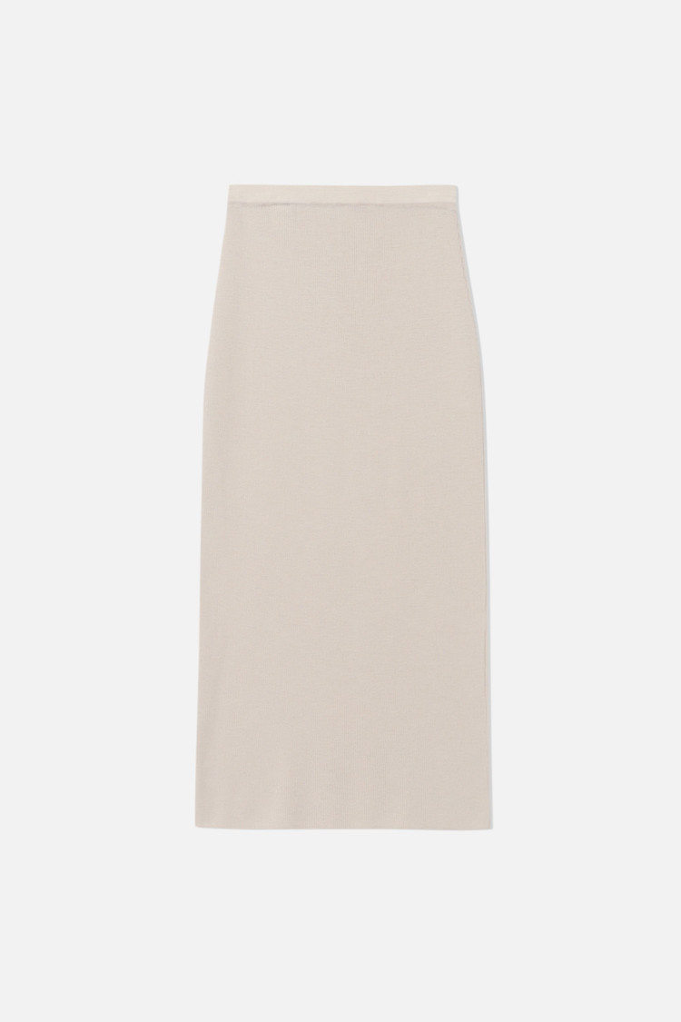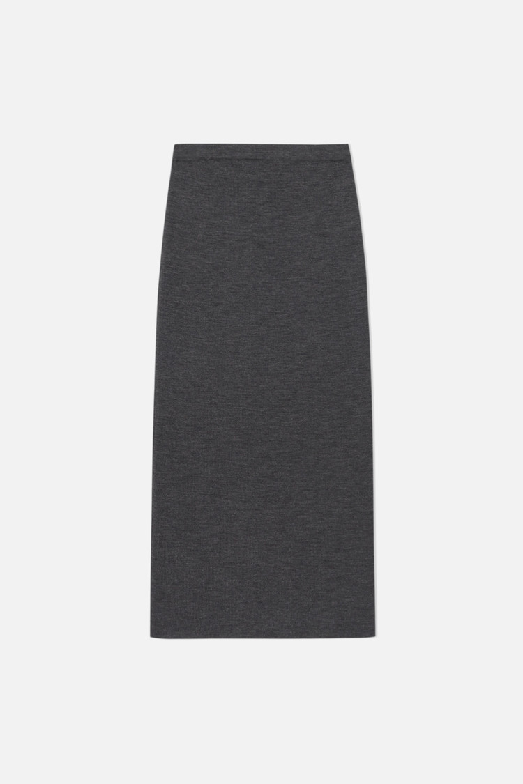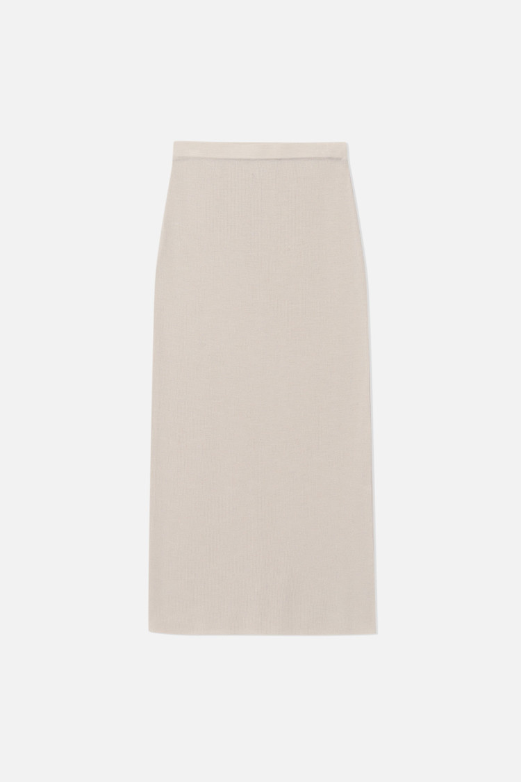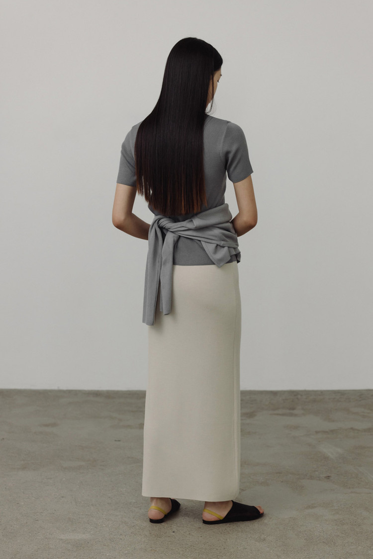 맥시한 기장감과 미니멀한 H 라인 실루엣이 정제된 무드를 자아내는 니트 스커트입니다.