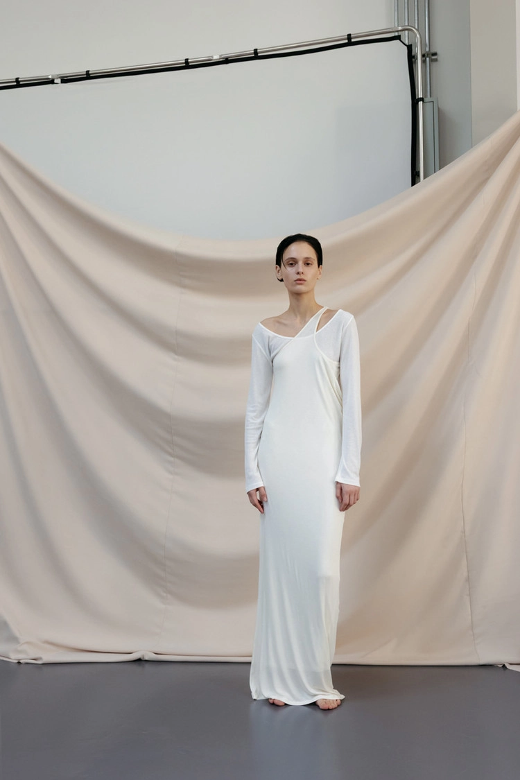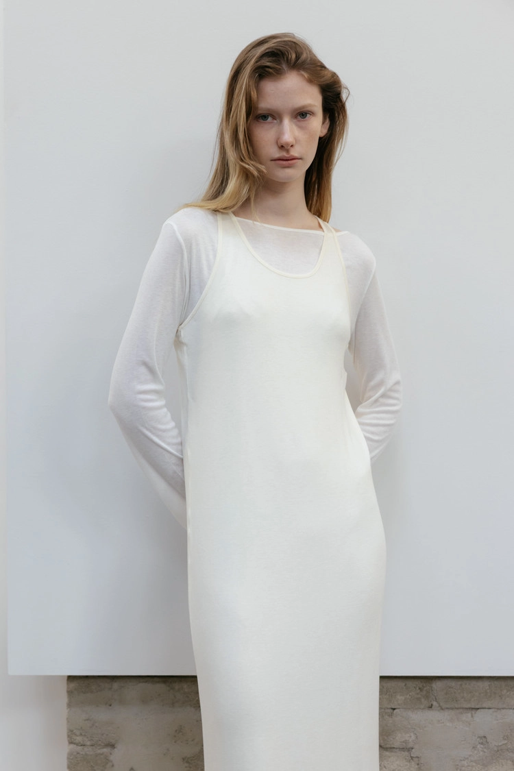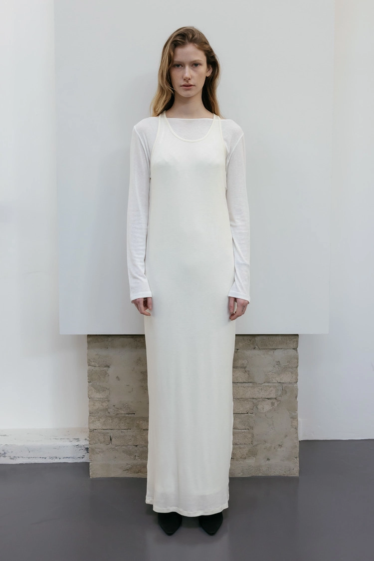 얇고 부드러운 소재로 제작된 슬림핏 슬리브리스 저지 롱 드레스입니다.